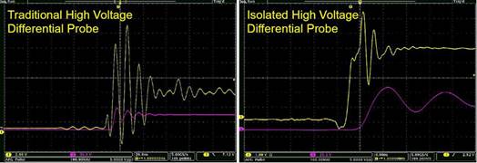 图8比较了使用传统高压差分探头与使用高性能隔离探头进行高压侧VGS 测量,明显可以看出,在传统探头提供的测量基础上,很难提取有意义的信息,制订设计决策。