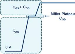在执行高压侧VGS测量时,工程师需要查看足够的波形细节,来确认仿真,评估信号特点,如与图7中表示的理想状态相比产生的振铃。高压侧VGS打开,第一个区域表示CGS门源充电时间,后面是米勒平台。在通道进行传导后,门将充电到最终值。