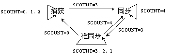 在本接收机MSP430的程序中将前方保护时间计数器和后方保护时间计数器简化为一个时间计数器,即SCOUNT。SCOUNT的初始值为0,每接收到一个正确的帧同步码,SCOUNT加1,当连续接收到三个正确的帧同步码时(SCOUNT=3)进入同步状态SFLAG=1,如果在同步状态中SCOUNT=4时,再检测到正确的帧同步码SCOUNT不再加1,也就是说SCOUNT的最大值为4;当检测到一个错误的帧同步码,SCOUNT减1,如果出现连续4个错误的帧同步码,SCOUNT减为0,则从同步状态进入捕获状态。