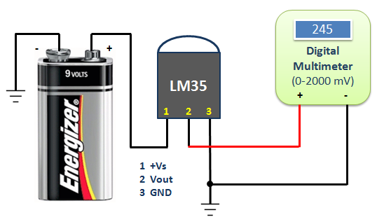 让我们看看下图所示的设置。此处,LM35传感器由外部9V电池电源供电,并且其输出是通过将数字万用表设置为电压表来测量的。 LM35输出与摄氏温度成线性比例,比例系数为+ 10mV/°C,这意味着如果温度为24.5°C,则万用表将传感器输出测量为245 mV。现在的问题是,如果将LM35传感器放置在万用表内部并由为万用表供电的同一电池(通常为9V或12V)供电,万用表的输出会相同吗?其实不是。让我们看看为什么。