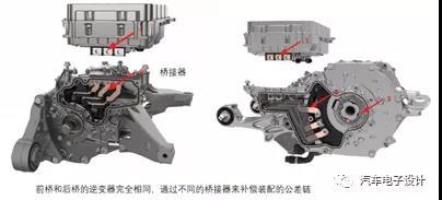 2) 都采用兼容的方式来做的,如下所示,Etron 是通过集成安装的布置,Taycan 是通过桥接器进行安装,这样同样的部件进行组合就可以得到不同的驱动桥