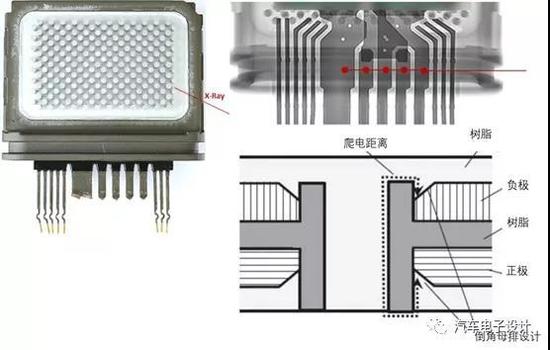 绝缘处理方面,除了将绝缘体完全覆盖在施加高电压的电极上进行绝缘以外,还能通过设置绝缘距离进行绝缘,但需要同时确保空间距离与爬电距离。为了延长绝缘树脂件的爬电距离,增加筋和槽,在总线端部设置倒角形状。下图树脂绝缘部分的截面图,功率模块的铜排被绝缘树脂隔开,为了延长爬电距离,除了在垂直方向上增加树脂的高度之外,还通过在绝缘树脂与总线接触的地方开缺口来保证爬电距离。