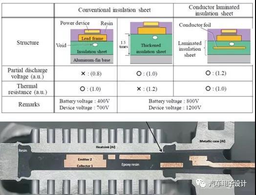 功率模块树脂片对焊接了功率器件的引线框架和散热片进行绝缘,树脂片大量填充了负责向散热片导热的陶瓷填料,实现了薄膜化,保证了较高的散热性能。但由于绝缘片与引线框架和散热片粘合时产生的小空隙可能会导致介电强度下降,因此导体箔被层压在绝缘片的内部。功率模块使用的绝缘片内部叠有导体箔,防止局部放电。 当施加到空隙的空气层的电压高于空气的介电击穿电压时,就会发生局部放电,通过用导体箔对施加到绝缘片的电压进行分压来减小空隙的电场。利用导体箔、引线框架与散热片之间的电位差分压至上下两层绝缘片,将导体箔的电位固定为中间电位,改善绝缘片的局部放电特性。
