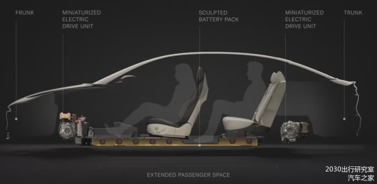 图1 Lucid的平台布置,电池做得比较矮,二排还做了空间避让