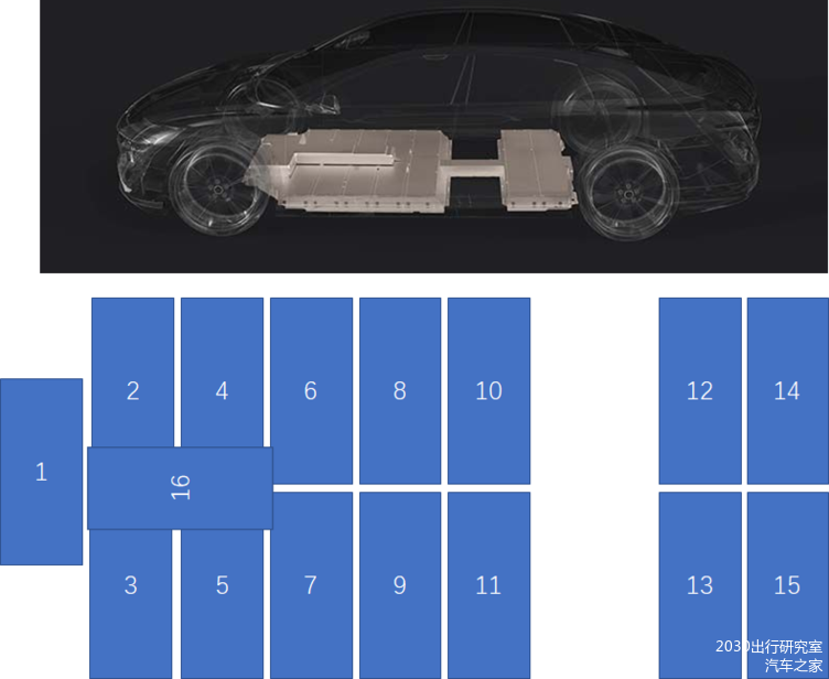 1)从下图来看,Lucid一共布置了16个模组,模组的布置是类似于早期的Model S/X或者像MEB那样布置的,所以未来做这种21700的大模组,比590做得更大一些其实有利于布置,按照这个数量单个模组的能量为7.06kWh,当然模组高度因为是轿车的原因牺牲了一些;