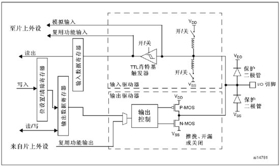 在芯片资料中我们可以看到,I/O口的基本结构如下(5V兼容I/O位的基本结构图省略):