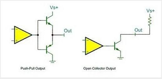 关于推挽输出和开漏输出,用一幅最简单的图形来概括:该图中左边的便是推挽输出模式,其中比较器输出高电平时下面的PNP三极管截止,而上面NPN三极管导通,输出电平VS+;当比较器输出低电平时则恰恰相反,PNP三极管导通,输出和地相连,为低电平。右边的则可以理解为开漏输出形式,需要接上拉。