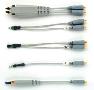 图 1 安捷伦公司的 InfiniiMax 探头有各种构置形式(从上到下):差分浏览器、差分焊合、差分插座、单端焊合、单端浏览器。探头本体(此处没有显示)与照片右侧的连接器匹配,包括探头放大器。该放大器为同轴电缆右手端提供来自探测头(左手远端)的 Z0 端接。所有的探头形式中,探测头中的衰减器为同轴电缆左手端提供 Z1 端接。