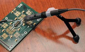 用过传统窄带示波器探头 -- 甚至是无源探头 -- 的人都很熟悉浏览器配置,这种浏览器配置可用来迅速接触并观察大量信号。人们历来一边手握探头一边浏览,但是,目前你必须探测的高速元件的微小几何结构要求用比人手更稳定的装置来夹持探头。现在,电气工程师们浏览时,探头通常是安装在小型操纵器或支架上的(图 3)。