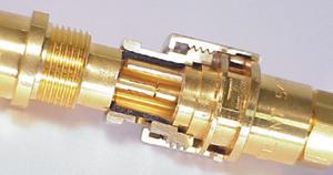 安捷伦公司在其 6GHz 带宽 Infin-iium 示波器中使用的是另一种方法。输入连接器是与 BNC 兼容的,但并不是真正的 BNC(图 5)。它是一种独创的 17.9 GHz 专有连接器,采用空气介质和一种锁定机构。这种锁定机构可与 BNC 配套使用,但也适应既用卡口式连接又用螺丝锁的专有配对连接器。一旦这种螺丝机构把电缆安装的和面板安装的配对连接器的各一半锁在一起,你就无法使配对连接器的各一半相对移动了。因此,这种设计消除了常规 BNC 在高频率下工作不可靠的主要原因。