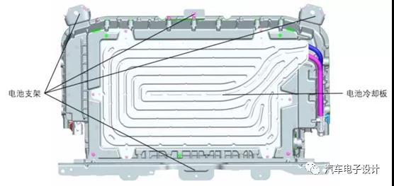 在设计中,我们看到奔驰是把冷却板安装在电池包外,如下图所示可以看到电池的冷却板和支架的示意图。