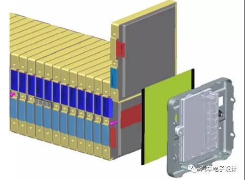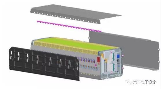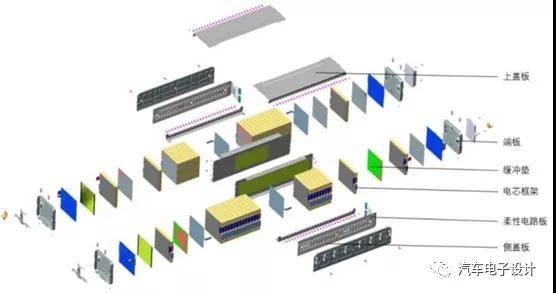 下面这个模组的爆炸图,非常清晰的向我们说明了模组里面的结构,采用电芯框架+泡棉,侧盖板和柔性电路板完成电气的采样和参数。上面的上盖板+端板形成一个坚固的结构。
