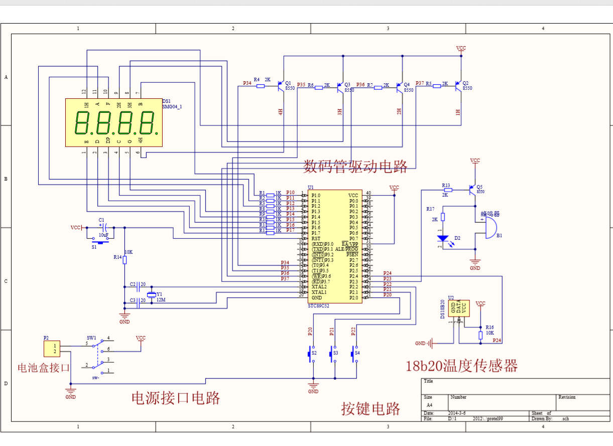 单片机实时检测温度传感器DS18B20的状态,并将DS18820得到的数据进行处理。上电后数码管显示当前的环境温度,通过按键可设置高低温报警值,当检测到的温度高于设置的报警值的时候,蜂鸣器报警同时报警灯闪烁,温度检测精确到0.1度。并具有掉电保存功能,数据保存在单片机内部EEPOM中,进入设置界面后如果没有键按下系统会在15秒后自动退出设置界面。