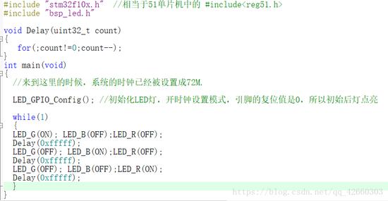 如果同样方法写在stm32中肯定是不行的了,首先因为stm32中没有51头文件中那样定义好了P0口可以直接进行总线操作,其次stm32中的gpio口默认是输入模式并且还需要打开相关引脚口的时钟。可能很多人会觉得stm32中官方给的固件库可以直接操作寄存器从而控制gpio口,但是我觉得我这样的初学者还是多了解下底层的方法便于更好的理解。要实现stm32点亮一个led灯(即让gpio口输出一个高电平)一共分三步: