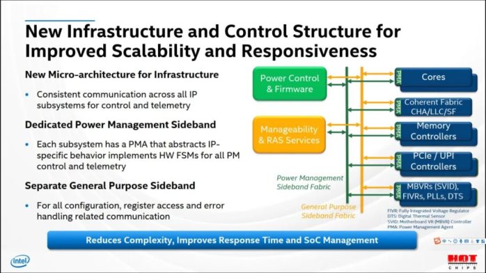 Icelake-SP架构使用10nm+工艺,采用Sunny Cove大核。相对于Cascake Lake,Ice Lake的IPC提高了18%,主要原因是大比例增加的各种资源,比如乱序执行窗口、物理寄存器、L1 Cache等。演讲的主要内容集中于IceLake-SP的系统架构,主要改进包括:可扩展的功耗控制、系统管理机制,可以减少SoC管理的复杂度,改进响应时间;对Cache机制的调整,缩短Cache的响应时间,提高通信带宽;从电路、算法和架构层面改进DVFS的效果。Intel将处理器核的电压频率调整时间缩短到0,体现了Intel的电路优化的根基。