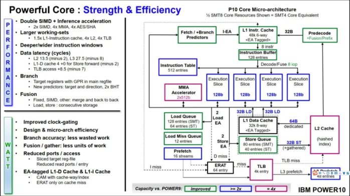 Power10是IBM的下一代架构,预计年底正式发布,采用7nm工艺。每块芯片可以集成16个核心,每个核心提供支持8线程。相对于前代产品,仍然是通过资源扩展来获得性能提升,有些模块的资源甚至被扩大了4倍(TLB、L2cache等)。IBM用了将近一半的篇幅介绍其PowerAXON接口和Open Memory Interface接口,这个接口的最大特点是高带宽和兼容性。两个接口都可以达到1TB/s的带宽。PowerAXON接口可以和其他芯片组成16块芯片的集群,可以连接到ASIC加速芯片集群,还可以连接到刀片服务器集群;OMI接口可以连接到SCM、DRAM以及GDDR DIMM。互联总线的兼容性为Power10构成的系统提供了强悍的可扩展性。