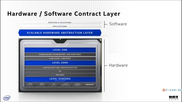 接下来的演讲介绍了Intel对于未来的愿景规划。Intel认为。在未来,通用处理器不会一统天下,多种计算资源(CPU、GPU、AI加速器、FPGA等)需要协同使用,有必要通过分层抽象统一调用接口。硬件的范畴将不仅仅包括处理器或专用芯片的设计,而是包括了驱动、OS、虚拟机以及中间件。软件的范围则是丰富多彩的业务软件和应用软件。Intel将构建包含了工艺封装、计算单元架构、存储、互联、安全和软件的完整体系。如果这套愿景规划成功,那么Intel将从一个芯片制造商转换为计算基础设施提供商(这就是新基建啊)。