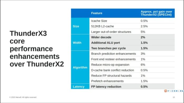 ThunderX3是Marvell的下一代ARM服务器处理器,预计60到96个core,每个core支持4SMT。处理器核采用Arm v8.3核芯,并支持部分v8.4/v8.5的特性。相对于ThunderX2,ThunderX3在资源和算法方面都进行了改进。在演讲中展示了各方面优化对于性能的贡献,其中比较重要的优化包括执行能力、ROB资源、分支预测算法、Cache容量等方面。ThunderX3的片上互联采用三环结构,每一个半环上连接5个节点,每个节点连接4个核心。