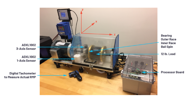 为了产生用于在 LTspice 中进行傅里叶分析的数据,将三个 ADXL1002 加速度计连接到电机,如图 1 所示,以测量侧向、垂向和纵向(分别为 X、Y 和 Z)振动。