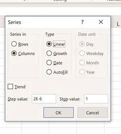 此时出现图 6 所示的对话框,选中列(Columns)和线性(Linear)单选按钮。在步进值(Step value)中输入 2E-6,在停止值(Stop value)中输入 1。