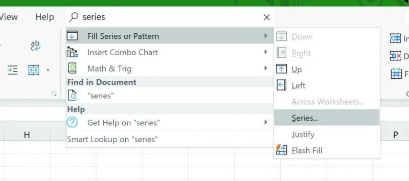 填充其余时间戳列数值的最简单方式是使用 Series 命令。在 Microsoft Excel 的搜索框中,键入“Series”以显示图 5 所示的菜单选项。