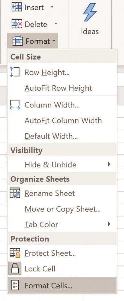 如果数据集很大,采样间隔短,则 Microsoft Excel 可能会将时间戳四舍五入为不恰当的小数位数。如果出现这种情况,则突出显示第一列,然后选择然后选择格式化(Format) > 格式化单元格(Format Cells),如图 8 所示。