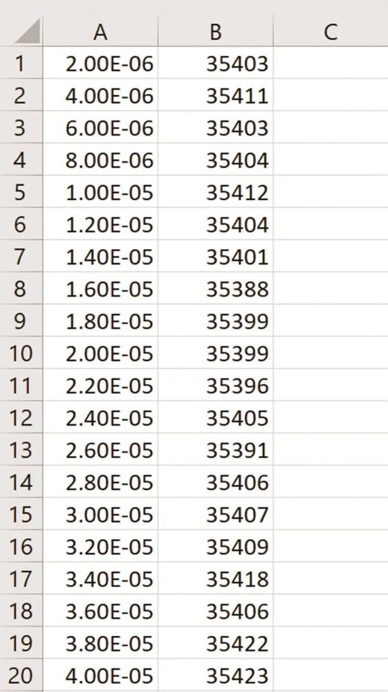 由于在一秒内提取了 500,000 个数据样本,每个数据点间隔 2 µs。因此,在新列的第一个单元格中,输入