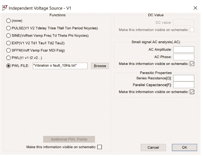 完成原理图后,右键单击每个电压源,选择高级(Advanced)按钮,选中 PWL 文件(PWL File)单选按钮,然后输入包含振动数据的相应文本文件的文件名,如图 12 所示。这将创建一个分段线性电压源,其中包含一系列电压及其相应的时间实例。如果这些文本文件与 LTspice 文件存储在同一目录中,则操作会更简单。