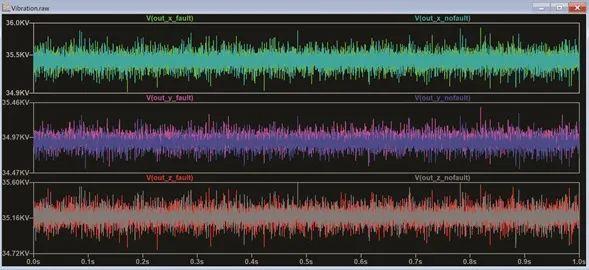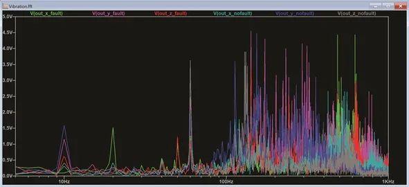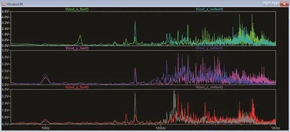 图 11. 显示故障电机和非故障电机振动数据电压输出的 LTspice 原理图。