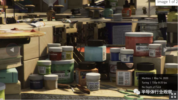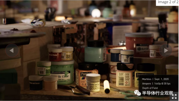 Nvidia还从其使用完整路径跟踪的Marbles技术演示中提供了上述指标。一个未命名的Turing GPU(RTX 2080 Ti?)那能够以720p和25 fps的速度运行Marbles,没有景深,只有一个圆顶灯和一个间接光。同时,Ampere(RTX 3090?)可以以1440p和30 fps的速度运行演示,并启用了景深和130个区域照明灯。结果是无论使用什么实际的GPU,都有可能将光线追踪提升到一个全新的水平。