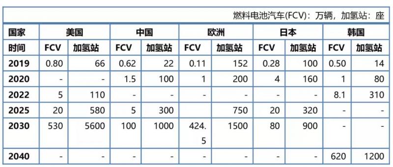 全球燃料电池汽车(FCV)及加氢站规划图(保有量规划)