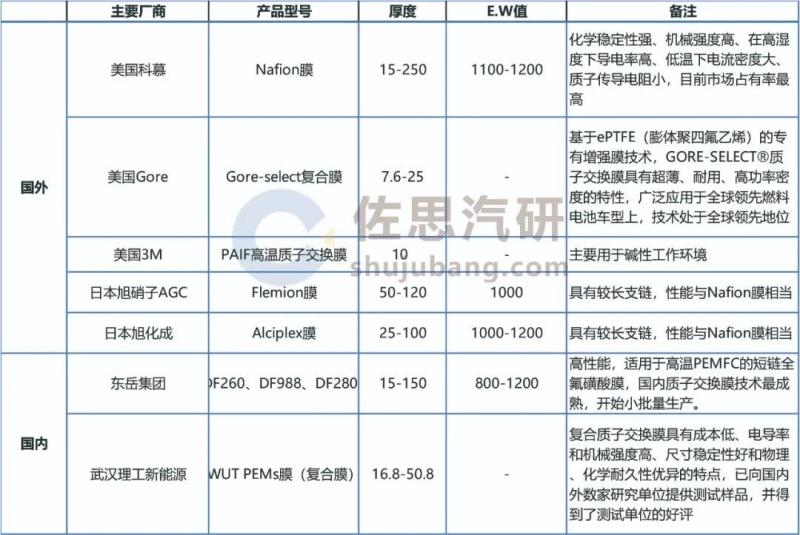 国内外质子交换膜主要供应商及产品性能