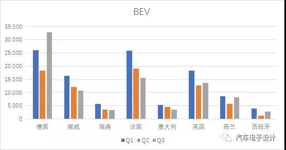 图 3 2020 年欧洲主要国家按季度分的 BEV 的情况