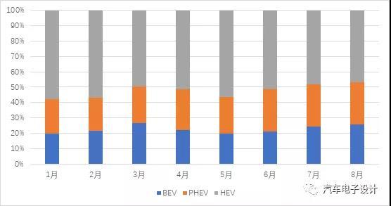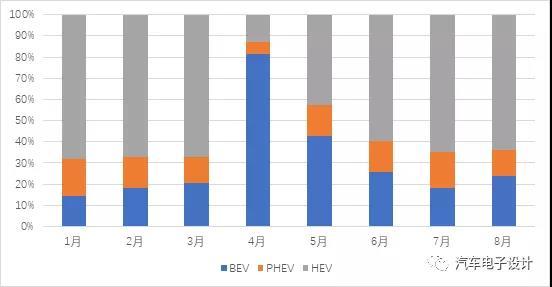 图 5 德国 BEV、PHEV 和 HEV 的月度比例关系