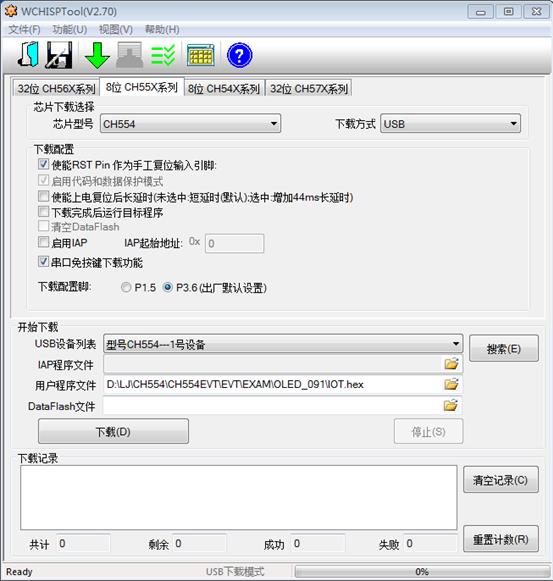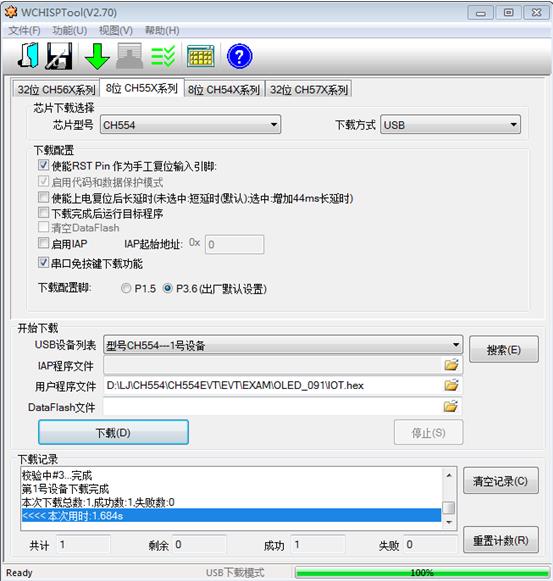程序编译后,需使用WCHISPTool来下载,在上电前需先按下DOWNLOAD键,上电后再释放。