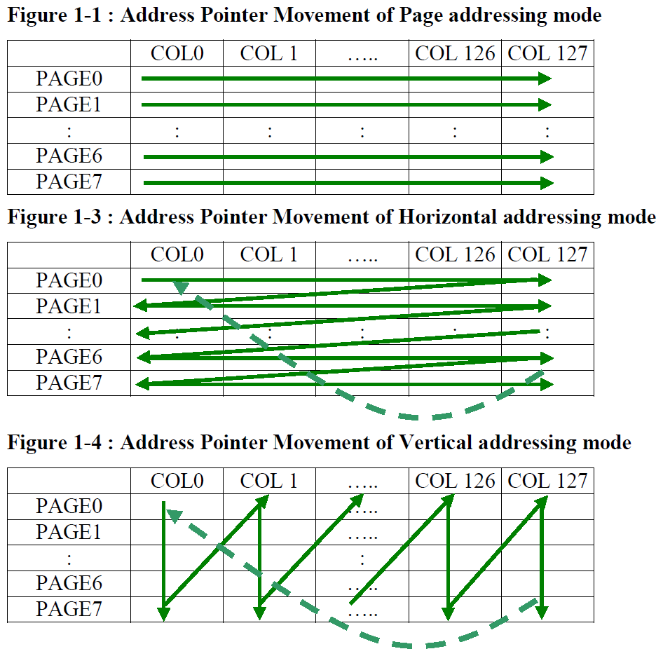 显存支持页面、水平、垂直三种寻址模式,伴随有一个指针,每写入一字节数据,指针就以某种形式增长,类似于我们在C中写的*ptr++: