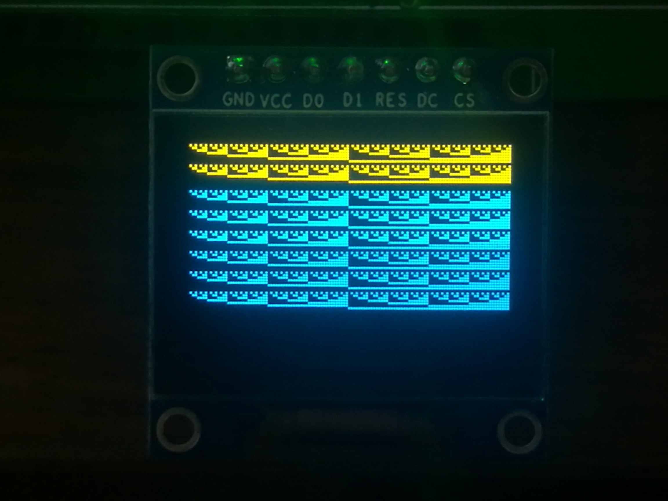 我们使用的是0.96寸OLED屏,它由128*64个像素点构成,上16行为蓝色,下48行为黄色,两部分之间有大约两像素的空隙。虽然有两种颜色,但每个像素点都只能发出一种颜色的光,因此这块OLED屏算作单色屏。