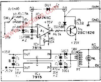 为了用恒定电流置偏待测试的齐纳二极管,将其接在OP放大器的反馈回路内,齐纳二极管反向电流IS由OP放大器的输出端供给,并由反相端流出。对于平衡电路的假设地来说,即使齐纳电压改变,也有恒定电流流过。需要改变电流时,可改变电阻R,R用R=-VCC/(IS)计算。