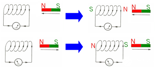 将上述两种物理现象结合后,安培定则及牛顿运动定律,就变成了楞次定律,其产生的基本方式描述如下,将磁铁接近一组线圈就如同下图所示,这因物理现象希望这两物体间能维持前一既有位置关系,当把磁铁往线圈靠近时,线圈会主动感应排斥力的磁极,好让两物体还是能维持相同的距离。反之,若磁铁是要受到外力影响产生要远离的力量,则线圈会主动感应出吸引的磁力,好让两物体维持相同的距离。