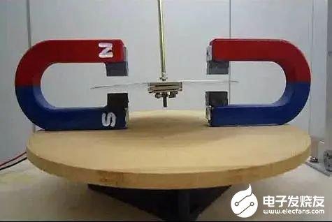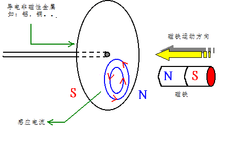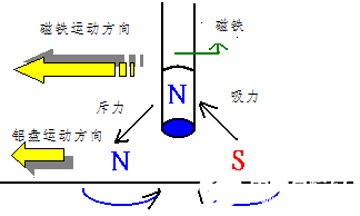 此时将磁铁顺着铝盘圆周宜动,则会顺着移动方向的前方产生排斥磁极,后方则因此磁铁要离开,改为形成吸力磁极。