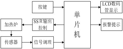 电阻炉温度控制器主要有单片机AT89C52、A/D转换器、按键、LCD显示、加热炉、传感器、SSR输出控制组成的控制系统。其组成框图如图2.2所示: