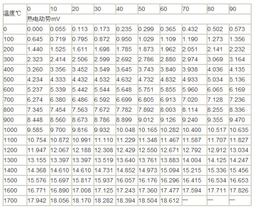 S型热电偶首先是标准化热电偶,偶丝直径规定为0.5mm,允许偏差-0.015mm,其正极(SP)的名义化学成分为铂铑合金,其中含铑为10%,含铂为90%,负极(SN)为纯铂,故俗称单铂铑热电偶。该热电偶长期最高使用温度为1300℃,短期最高使用温度为1600℃。而且S型热电偶在正常长期使用温度为800~1300℃左右时测量的精度最高,而在800℃以内的测温准确度不高,而长期使用温度在1300℃以上就很容易损坏热电偶。因此我们在对其分度表的计算时温度设定为0~1300℃,因为电阻炉正符合其要求,并为长期使用电器。
