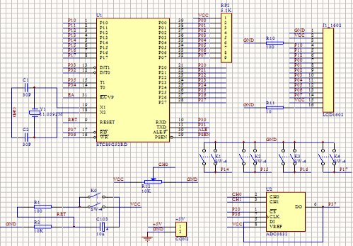 该电阻炉温度控制器中使用了STC89C52单片机,以及ADC0832A/D转换器、晶振电路、复位电路、按键、LCD1602液晶显示器。其连接原理图如图3.2: