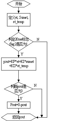 值),偏差之和sumet,连续两偏差之差et_temp;然后判断20ms标志flag2是否为1,若是,进行PID计算,算出pout,若否,输出上次pout。此PID为了显示方便,保证输出为正,因此判定pout是否为负。
