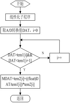 性标度变换是热电偶采集温度与A/D转换器之间的桥梁,是关键性环节,流程图如图4.3所示在程序中,DAT代表A/D线性标度变换值,首先DAT与转换值进行比较,判断其符合哪一个段内;MDAT表示显示温度值,当DAT判断其处于哪一个段内,这样根据线性标度变换公式,即可求出其采集的温度值;之后返回温度值MDAT,以备LCD显示器显示。