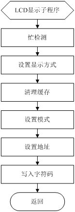 根据设计要求,进行LCD显示程序的编写,流程如图4.6所示。液晶显示模块是一个慢显示器件,所以在执行每条指令之前一定要确认模块的忙标志为低电平,表示不忙,否则此指令失效。设置显示的字符模式,显示字符时要先输入显示字符地址,也就是告诉模块在哪里显示字符,最后将字符码写入到指定位置。