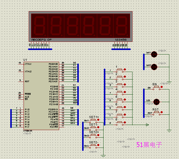 #include #include void Setsecond();//抢答器答题和抢答时间的设置函数声明 void delay(int k); //延时函数声明 //数码管选管位 sbit Sel1=P2^0; sbit Sel2=P2^1; sbit Sel3=P2^2; sbit Sel4=P2^3; sbit Sel5=P2^4; sbit Sel6=P2^5; //抢答器的状态指示灯 sbit led=P2^6; //显示复位和设置时间的状态 sbit Led1=P3^1; //抢答失败时,该灯会一直闪烁 sbit Led2=P3^2; //答题完毕时,该灯会一直闪烁 //抢答器初始化抢答和答题时间按键 sbit Set1=P3^3; //设置抢答时间,+ sbit Set2=P3^4; //设置抢答时间,- sbit Set3=P3^5; //设置答题时间,+ sbit Set4=P3^6; //设置答题时间,- sbit RST=P2^7; //抢答器的复位按键 sbit EN=P3^0; //抢答器使能和设置抢答和答题时间按键 unsigned char Tshu1=11,Tshu2=31,shu1=11,shu2=31,shu;//抢答器抢答时间和答题时间的相关变量 unsigned char count0=0,count1=0,roberflag=0,scond1=0,second2=0,robernum=0;//抢答者的相关变量 unsigned char Shuma[10]={0x3f,0x06,0x5b,0x4f,0x66,0x6d,0x7d,0x07,0x7f,0x6f};//数码管段码值 bit Enflag=0; //抢答器使能的工作标志变量,0表示正常工作,1表示设置时间(抢答和答题) void main() //主函数 { unsigned char n=0; TMOD=0x11;Led1=0;Led2=0; TH0=(2^16-50000)/2^8;TL0=(2^16-50000)%2^8; TH1=(2^16-50000)/2^8;TL1=(2^16-50000)%2^8; TR0=1;ET0=1;TR1=1;ET1=1;EA=1; while(1) { for(n=0;n<6;n++) //这个循环,实现数码管的动态显示 { switch(n) { case 0:Sel1=1,Sel2=0,Sel3=0,Sel4=0,Sel5=0,Sel6=0; if(Enflag == 0) P0=~Shuma[shu/10]; else P0=~Shuma[shu1/10];break; case 1:Sel1=0,Sel2=1,Sel3=0,Sel4=0,Sel5=0,Sel6=0; if(Enflag == 0) P0=~Shuma[shu%10]; else P0=~Shuma[shu1%10];break; case 2:Sel1=0,Sel2=0,Sel3=1,Sel4=0,Sel5=0,Sel6=0;P0=0xBF;break; case 3:Sel1=0,Sel2=0,Sel3=0,Sel4=1,Sel5=0,Sel6=0;P0=0xBF;break; case 4:Sel1=0,Sel2=0,Sel3=0,Sel4=0,Sel5=1,Sel6=0; if(Enflag == 0) P0=~Shuma[robernum/10]; else P0=~Shuma[shu2/10];break; case 5:Sel1=0,Sel2=0,Sel3=0,Sel4=0,Sel5=0,Sel6=1; if(Enflag == 0) P0=~Shuma[robernum%10]; else P0=~Shuma[shu2%10];break; } delay(20); P0=0xff; } } } void delay(int k) //延时函数,主要是为了数码管的动态显示 { while(k--); } void Timer0() interrupt 1 //定时器0,主要用于各种按键的扫描,每200ms一次 { TH0=(2^16-50000)/2^8;TL0=(2^16-50000)%2^8; count0++; P1=0x00; if(count0 == 5) { count0=0; Setsecond(); //调用设置时间函数,检测是否有设置时间的动作 if(RST == 0) //检测是否有复位动作,有动作,则实现部分变量初始化值 { roberflag=0; robernum=0;shu=0; led=~led;Led1=0;Led2=0; shu1=Tshu1;shu2=Tshu2; } if(EN == 0) { Enflag=~Enflag; led=~led;Led1=0;Led2=0; } if(Enflag == 0) //正常工作时候的,抢答人号码的识别和显示(同时判断8口,不准次扫描,无优先级) { if(P1 != 0x00) { if(roberflag == 0) //只有在抢答时间才能抢答,roberflag=0表示抢答,1答题,2抢答失败,3答题完毕 { roberflag++; switch(P1) { case 0x01:robernum=1;break; case 0x02:robernum=2;break; case 0x04:robernum=3;break; case 0x08:robernum=4;break; case 0x10:robernum=5;break; case 0x20:robernum=6;break; case 0x40:robernum=7;break; case 0x80:robernum=8;break; default:break; } } } } } } void Timer1() interrupt 3 //定时器1主要是用于工作时的数码显示,跑表,1一秒刷新一次 { TH1=(2^16-50000)/2^8;TL1=(2^16-50000)%2^8; if(roberflag == 2) Led1=~Led1; if(roberflag == 3) Led2=~Led2; count1++; if(count1 == 20) //正常工作时候的跑表 { if(Enflag == 0) { if(roberflag == 0) //抢答时间的跑表 { shu1--; shu = shu1; } if(roberflag == 1) //答题时间的跑表 { shu2--; shu = shu2; } if(shu1 == 0) roberflag=2; if(shu2 == 0) roberflag=3; } count1=0; } } void Setsecond() //抢答时间和答题时间设置函数,也是被T0调用,实现设置时间功效。