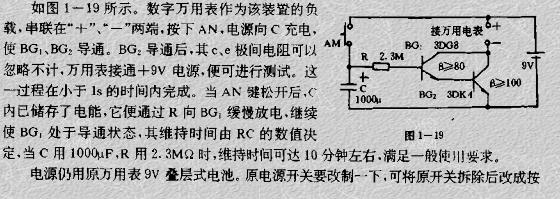 在DT-830型数字万用表上装了一个简易的自动关机电路,该装置体积小,构造简单,无需调试,原则上可适合于任一种数字万用表。
