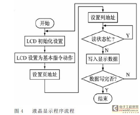 MSP430 单片机通过中断接收主通信控制器发来的数据,并将接收到的数据送给LCD 显示。通信参数设置为波特率为1200bps,8 个数据位,CRC 校验。对接收到的数据汉字采用16*16 的点阵、字母和数字母采用8*16 的点阵显示。由于需要显示的汉字、字母和数字是固定的,所以采用直接固化显示字模到FLASH 中的方法。这种方法占用空间少,程序实现简单,显示速度快,适合字模数据库不大的情况。液晶显示程序流程如图4 所示。