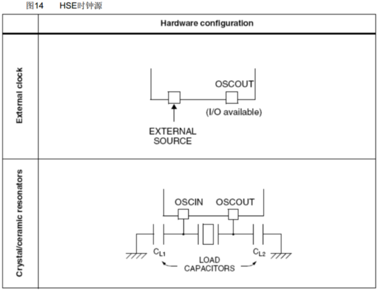 1.1 外部晶振和外部时钟信号(HSE)的不同点是,外部晶振是通过晶体谐振器,两个负载电容和单片机内部的电路想配合而产生时钟信号;而外部时钟信号是一个质量好且稳定的信号直接为单片机提供时钟。